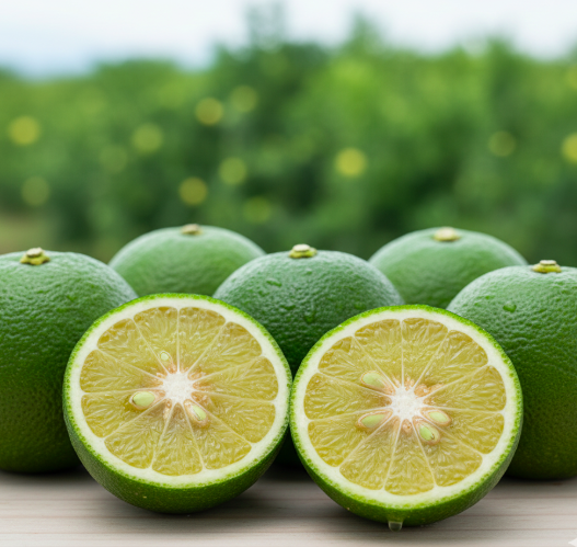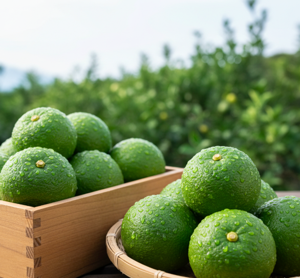 大分市産カボスの最大の特徴は、皮に含まれる精油成分の多さ。包丁を入れた瞬間に広がる香りは、レモンやライムとは一線を画す、深みのある和の香りです。料理の仕上げに一搾りするだけで、高級料亭のような一皿に変わります。
